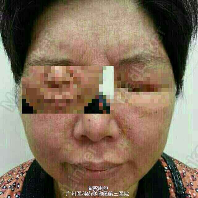 面部皮疹8个月,全身皮疹3个月。 患者女性,48岁,8个月前出现面部红肿,轻微瘙痒,当地诊所按“过敏”治疗效果不佳。3个月前开始全身多处出现皮疹,轻微瘙痒,伴肌肉无力,吞咽困难。