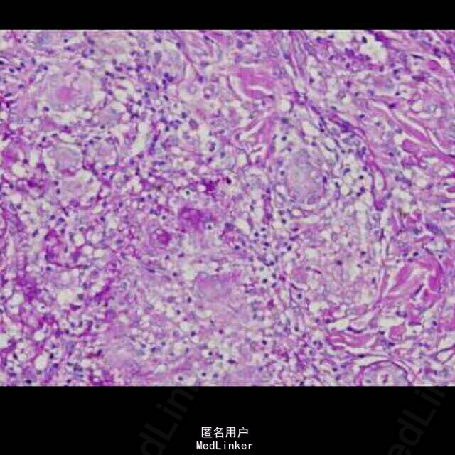 查体见双眼内眦鼻根处各有一黄豆大的淡红色的丘疹,触之有点硬,无触痛,其余无明显异常。 病理示真皮非特异性肉芽肿,皮损中央为化脓区,周围由组织细胞、上皮细胞和多核巨细胞组成的结核样结构。有浆细胞和淋巴细胞浸润。