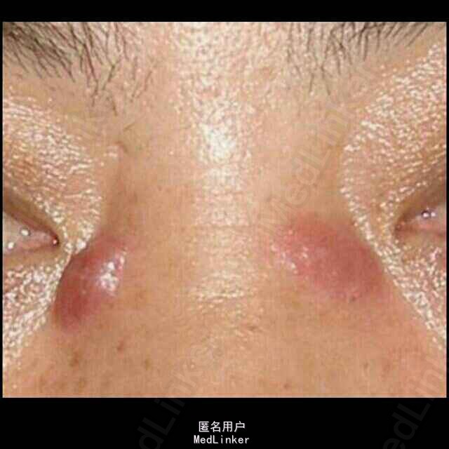患者女,32岁。发现双眼内眦鼻根处皮疹一年。大小有黄豆大,颜色粉红,无明显自觉症状,其他均无明显异常。