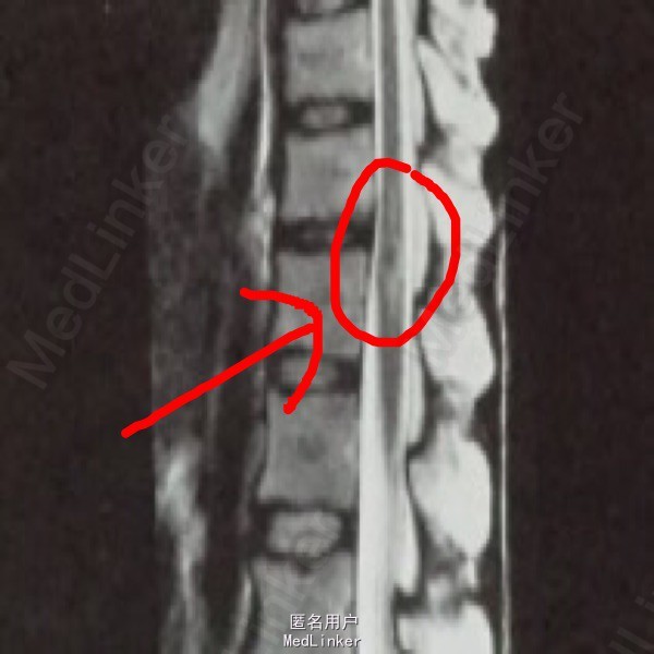 查体示体温轻度增高,肺部可闻及广泛湿啰音,脊椎无压痛。MRI示椎管内脊髓结构不规则,腰1脊髓对应处有高密度影参杂,密度不均匀。