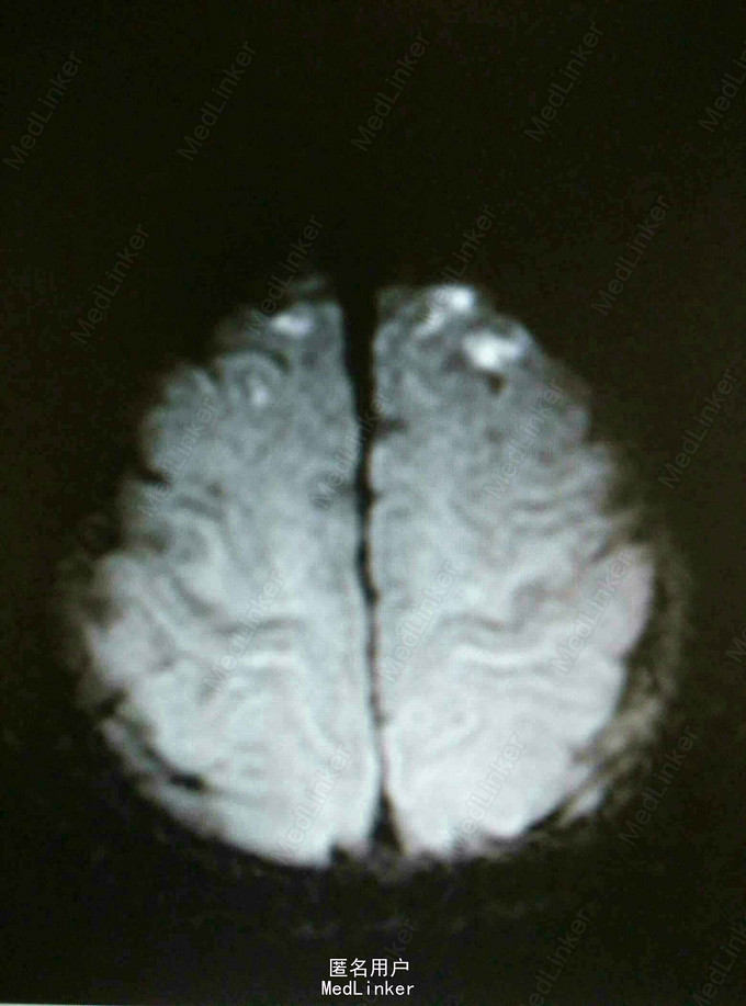 神经系统查体正常。 辅助检查:脑CT:未见明显异常。 进一步头增强MRI如图:FLAIR可见双额叶及顶叶沿皮质走行条状高信号,DWI可见双额叶点状明显高信号及顶叶脑回略高信号,增强脑实质未见异常,上矢状窦空三角征不很明确,T1无明显异常。