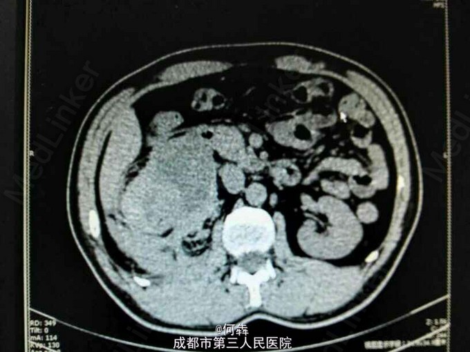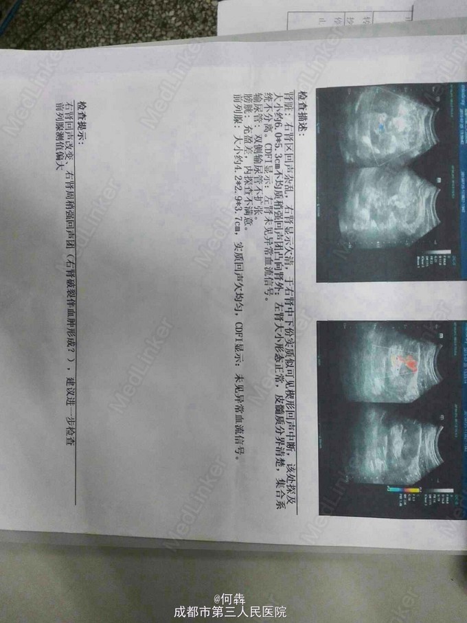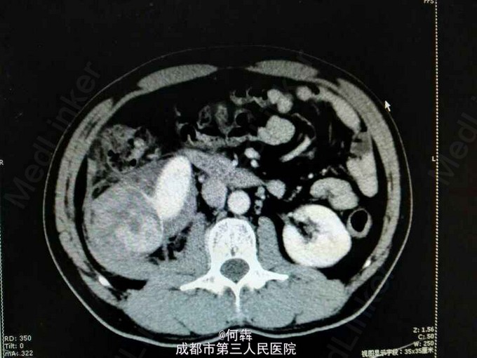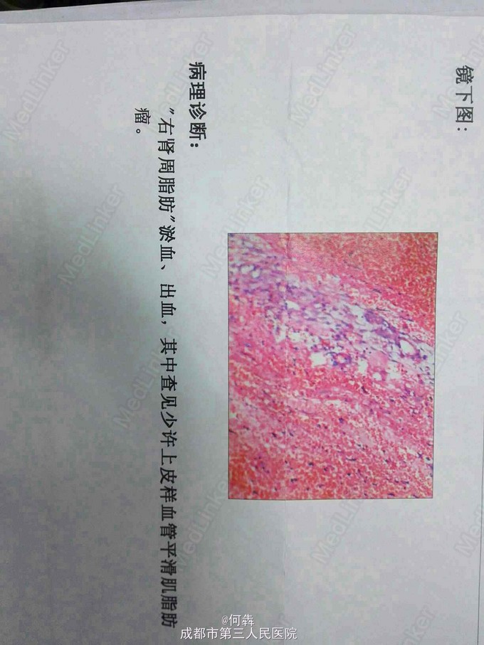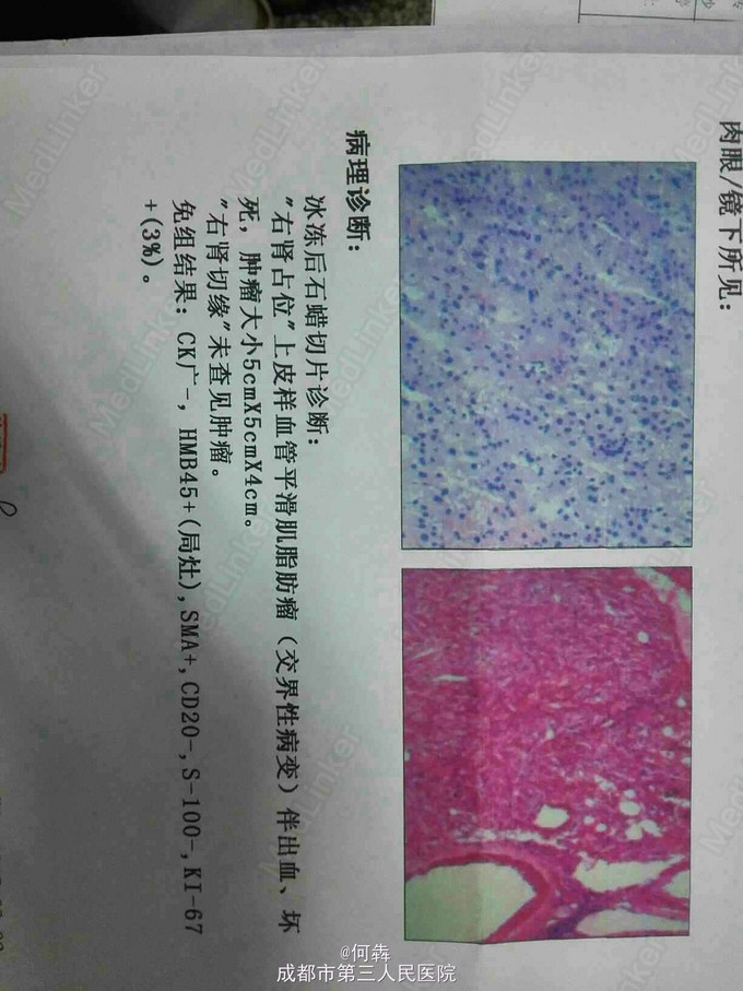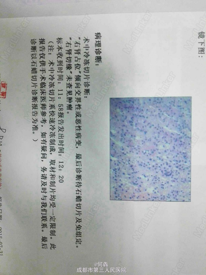 右肾占位伴出血。入院后6天在全麻下行右肾部分切除术。术中冰冻及术后病检见图片