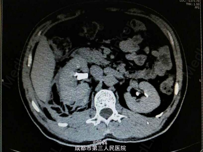 48岁男性,因“突发右腰痛1小时”入院,无血尿、外伤。既往无高血压、糖尿病。