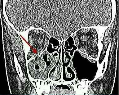 眼部检查:患者近视力1.0,无视野缺损。第一眼位如图1所示。右眼上视有-4的眼球上转不足(图2),下视有-2的下转不足。左眼运动正常。双眼水平运动正常。右眼第一眼位时眼压为13mmHg,上视时眼压增加至23mmHg。左眼眼压为12mmHg。瞳孔正常,双眼附属器以及前后节正常。眼球无震颤。颌面部CT(图3)显示右眼眶底轻微骨折。