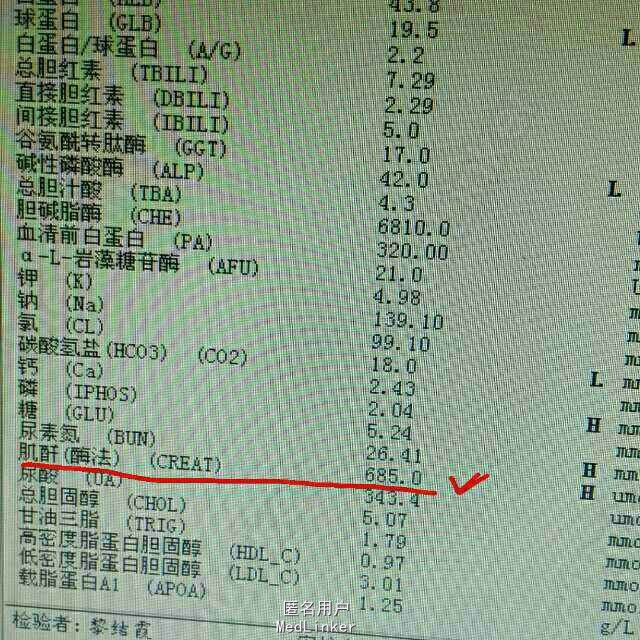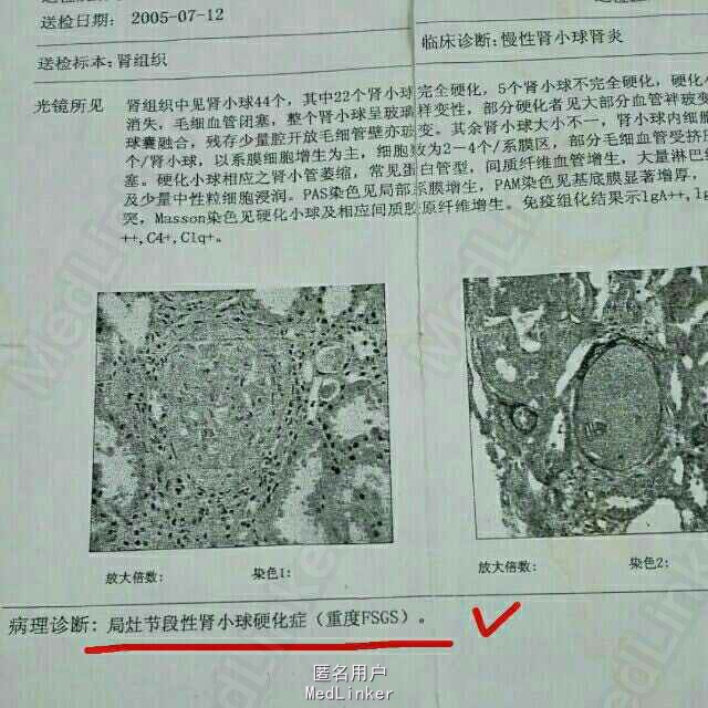 患者10年前肾穿刺活检提示为局灶节段性肾小球硬化症。入院后检查肌酐为685umol/L(刚刚透析过)。