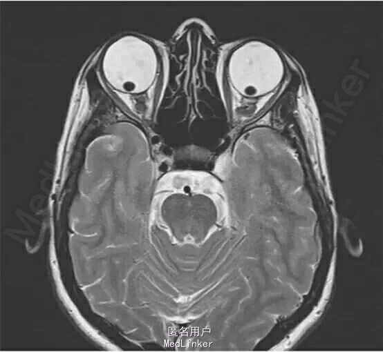 眼科查体:双眼巩膜呈蓝色,双眼视力明显下降,右眼视力为 0.25,左眼为 0.05,双眼眼压正常;瞳孔散大后裂隙灯检查发现双眼晶状体脱位入玻璃体腔,眼底检查发现存在视网膜变性,但是未见视网膜撕裂及视网膜脱离的任何迹象。 患者出现无法解释的听力下降而予以头颅 MRI 扫描,在眼眶的 MRI 扫描 T2 影像图片(图 1)中可见双眼晶状体向后异位入玻璃体腔。 图 1:患者头颅 MRI 扫描中经眼眶层面的 T2 影像