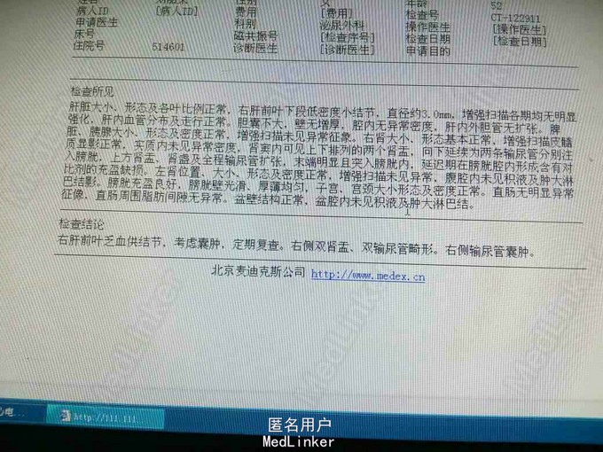 患者,女,51岁,因排尿不适来我院行B超检查发现右侧输尿管口囊肿。