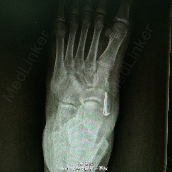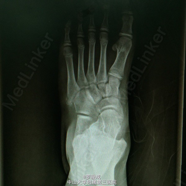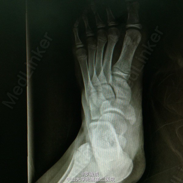 左足内侧疼痛2年余 两年余前运动后出现左足内侧疼痛,伴胀痛,无放射痛,无足部麻木。近来症状加重,遂前来我院就诊,X线提示左足副舟骨综合症。