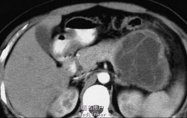 胰腺囊腺瘤占胰腺肿瘤的1%~10%,有浆液性囊腺瘤和黏液性囊腺瘤两类病理分型。好发于女性,胰尾部多见。 鉴别诊断:胰腺假性囊肿;胰腺癌囊变;胰腺实性-假乳头状瘤。