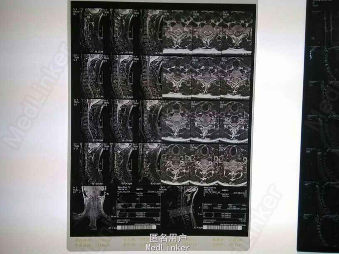 患者男,24岁,以外伤后颈部疼痛、双上肢麻木1小时入院。患者半月前游泳时不慎跌倒致伤,当即颈部疼痛,双上肢麻木,活动不能,无神志丧失,无恶心、呕吐。入院后查体:神清,精神差,生命体征正常。颈部压痛,给予颈托固定,心肺腹无异常,双下肢肌力肌张力可,双侧巴氏征阴性,双上肢肌张力可,肌力4级,双肘内侧痛觉过敏,双手麻木痛觉减退,左手重于右手。 治疗上给予甲泼尼龙针、甘露醇液+地塞米松针、神经妥乐平针、神经节苷酯针、骨肽针等综合治疗半月,现四肢肌力肌张力可,双肘部痛觉过敏明显减轻,右手麻木感觉基本同正常,左手拇食指感觉基本同正常,余三指麻木感较重,双手握力可。 患者现给予保守治疗,对于手术治疗与否意见不一,敬听各位高论