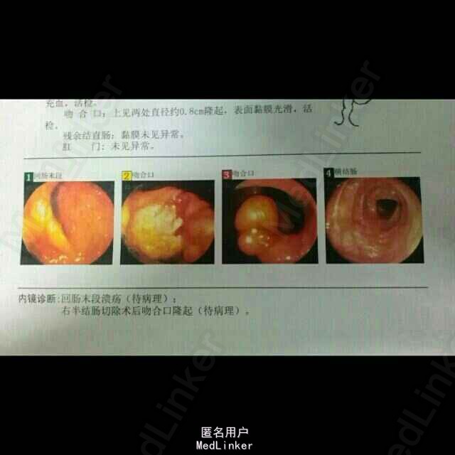 患者,男,35岁,因“反复右下腹疼痛5年”入院。5年前无明显诱因出现右下腹隐痛,在当地医院诊断为急性阑尾炎后行阑尾切除术。2011年经常右下腹胀满不适,没有疼痛。2012年右下腹隐痛,时有加重。2013年12月在当地医院就诊查全消化道造影:回盲部肠管改变,考虑慢性炎症并周围牵拉粘连改变。2014年3月当地医院行腹腔镜下肠粘连松解术,术中发现回盲部巨大溃疡,3*2.5cm,改行右半结肠切除术。术后右下腹仍有yint。为求进一步诊治,收入院。现仍有右下腹隐痛,大便1-2次/天,黄色成形软便,偶有烂便,无口腔溃疡,无关节痛,无会阴部溃疡,无发热,无盗汗,近期体重无明显改变。
