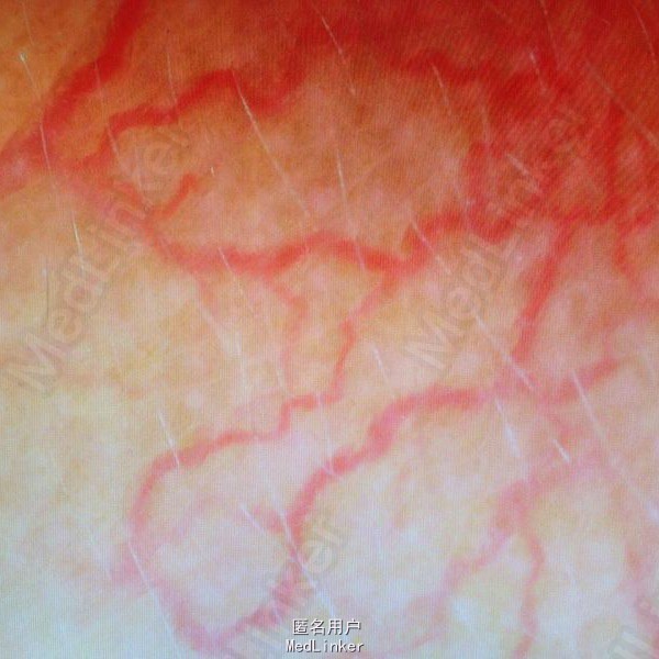 查体:右面部血管扩张,呈放射状。 皮肤镜下见局部较多树枝状血管。