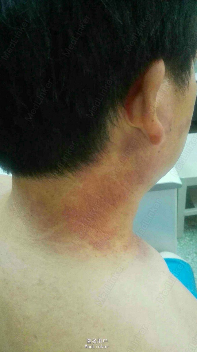 治疗二周复诊,血清酶降至正常水平,肌力正常,肌肉压痛消失,面部红斑轻度减淡。继续治疗二周,红斑明显消退,激素减量至甲强龙30mg,继续治疗。 本例患者因双眼睑水肿性红斑提示皮肌炎,经追问病史及进一步查体发现肌力下降和肌肉压痛,经实验室检查确诊。皮肌炎的皮肤病理并不具有诊断意义,如本例患者的皮肤病理与盘状红斑狼疮相似。