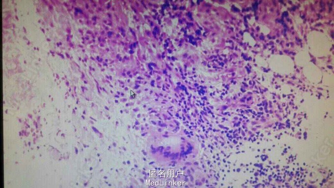 皮肤病理结果提示符合结节性红斑改变。给予口服美洛昔康,碳酸钙,氯化钾,静滴复方甘草,丹参川穹嗪,附加红光治疗后疼痛缓解,皮疹消失。