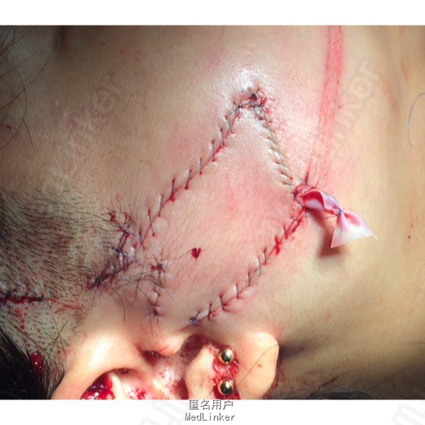 右面郭不规则线状创口,深达肌层,部分深达腮腺。面神经功能可