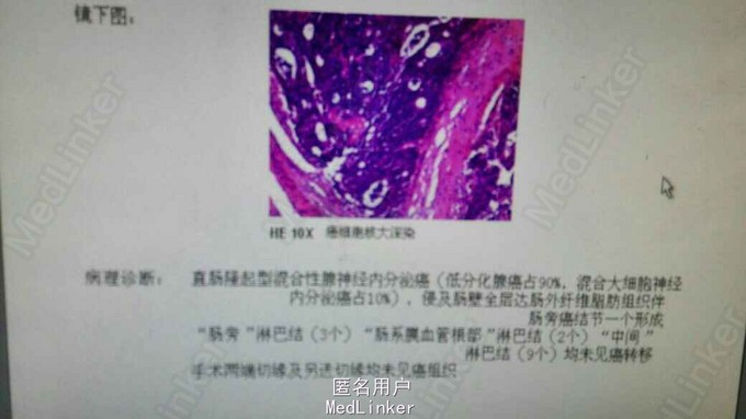 完善相关检查后,行全麻下腹腔镜辅助直肠癌根治术,术后病理提示直肠隆起型混合性腺神经内分泌癌。