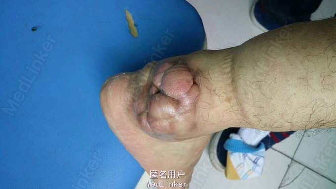 彩超和ct 都提示实性占位,dr提示未侵犯骨骼。实际查体还可查及右踝包块上方5cm 皮下脂肪瘤,大小 8x3x2,右踝包块旁血管瘤,大小2x2x1