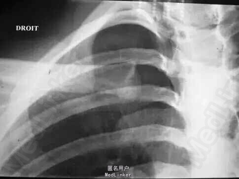 查体:胸前部略肿胀,左侧胸锁关节处隆起,触痛,可触及浮动感,左肩活动时疼痛加重,余未见异常。 辅检:门诊X线片:左侧胸锁关节脱位