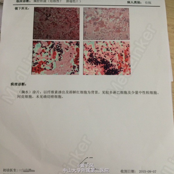随访:抗结核治疗后复查肝功能无明显异常,复查胸片示胸水无增多,遂予带药出院,嘱其结核病院继续治疗。 讨论:胸腔积液病因以结核性或肿瘤性多见。肿瘤性积液多见于中老年患者,且胸水为血性多见;结核性多见于年轻患者,多伴有结核病全身表现,胸水多为浅黄色或淡绿色。该病例中,患者年轻、有低热、咳嗽,胸水为渗出性且以淋巴细胞为主,虽无病原学检查支持,但据临床经验还是给与抗痨治疗。
