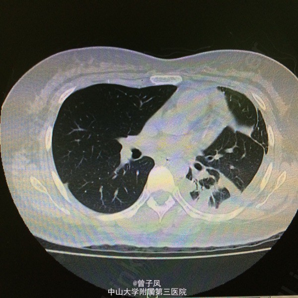 查体:左肺呼吸音明显减弱,右肺正常,未及干湿啰音。 辅助检查:ESR 33mm/H,CRP 50.3mg/L,T-SPOT阳性。风湿二项、ENA谱、抗磷脂抗体、血培养、降钙素原、血常规未见明显异常。结核抗体、PPD、痰涂片找抗酸菌、痰培养阴性。