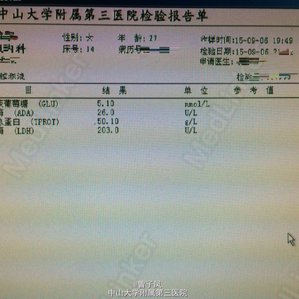 诊断:结核性渗出性胸膜炎,肺结核? 行胸腔闭式引流,引流出淡黄色液体,送胸水检查示渗出性,以淋巴细胞为主。复查胸片示胸水较前吸收后,查胸部CT示:考虑左肺浸润性肺结核并结核性胸膜炎,右下肺炎症。 予“异烟肼、利福平、乙胺丁醇”抗结核治疗,并与拜复乐抗感染治疗,辅以止咳治疗。