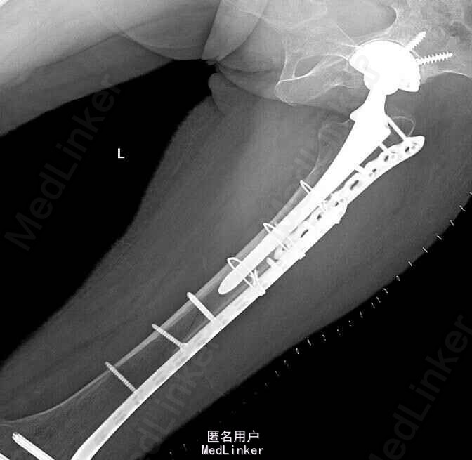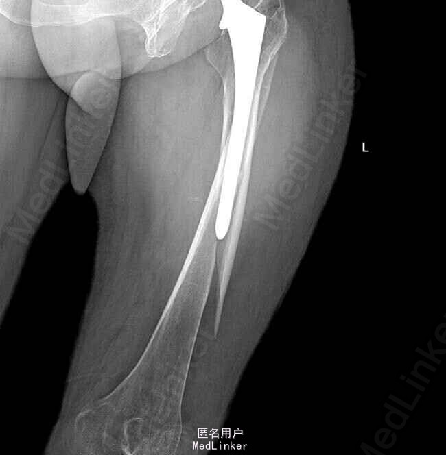 左髋部可见长度约15cm的陈旧手术切口,左下肢外旋约45度,肿胀明显,大腿中下1/3外侧压痛明显 左股骨X线片:左侧股骨干骨折;左侧全髋置换术后。