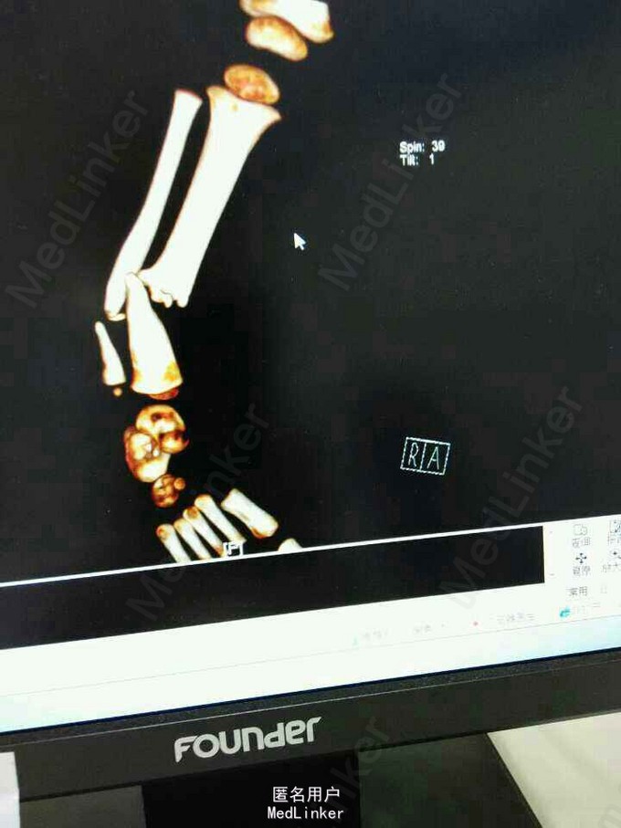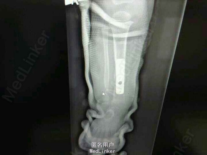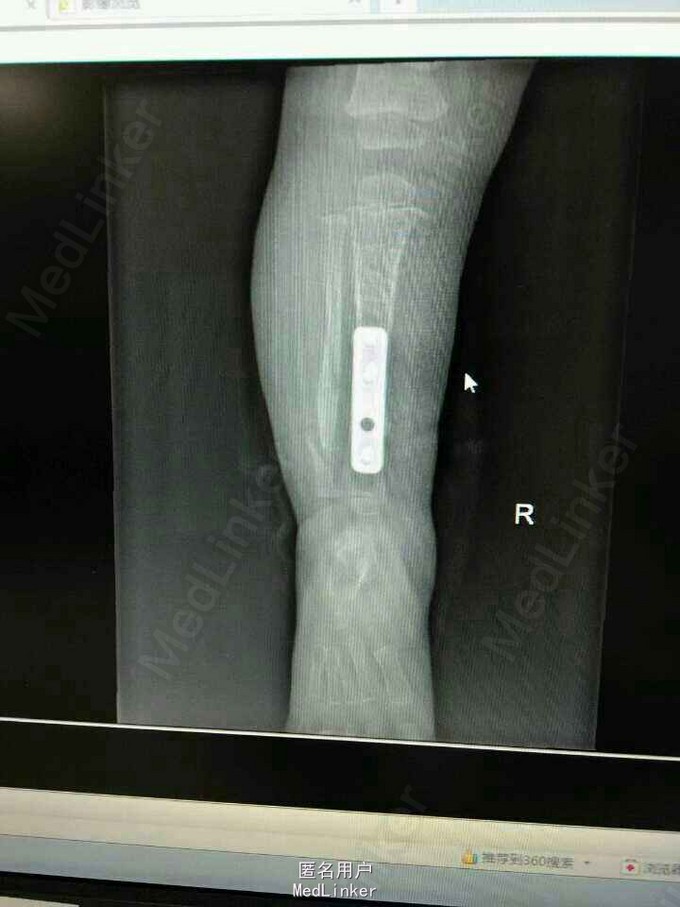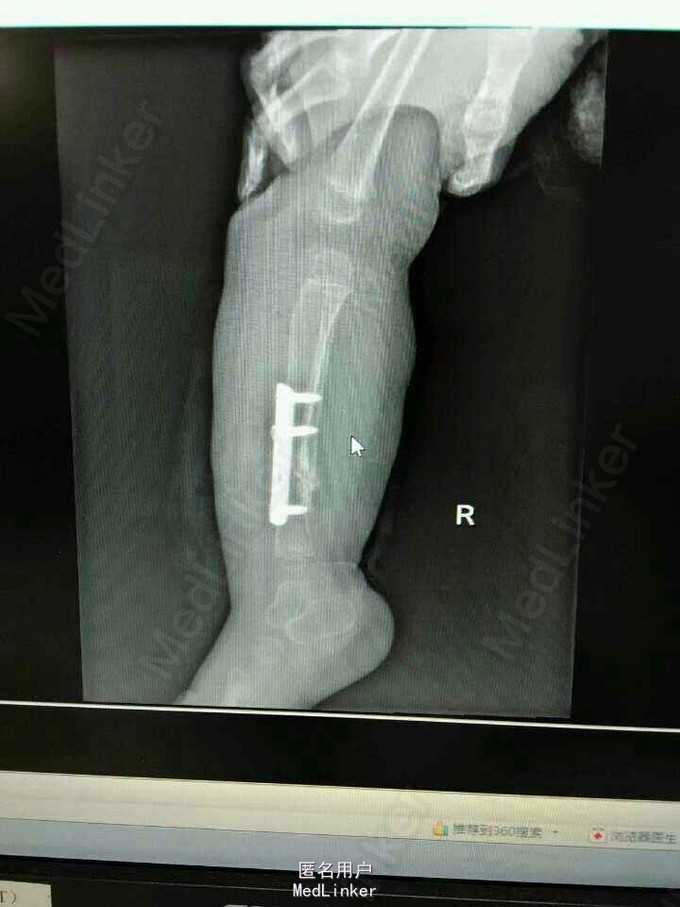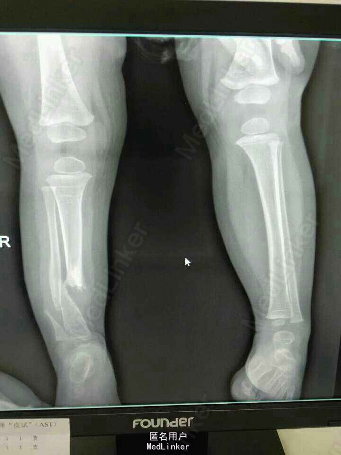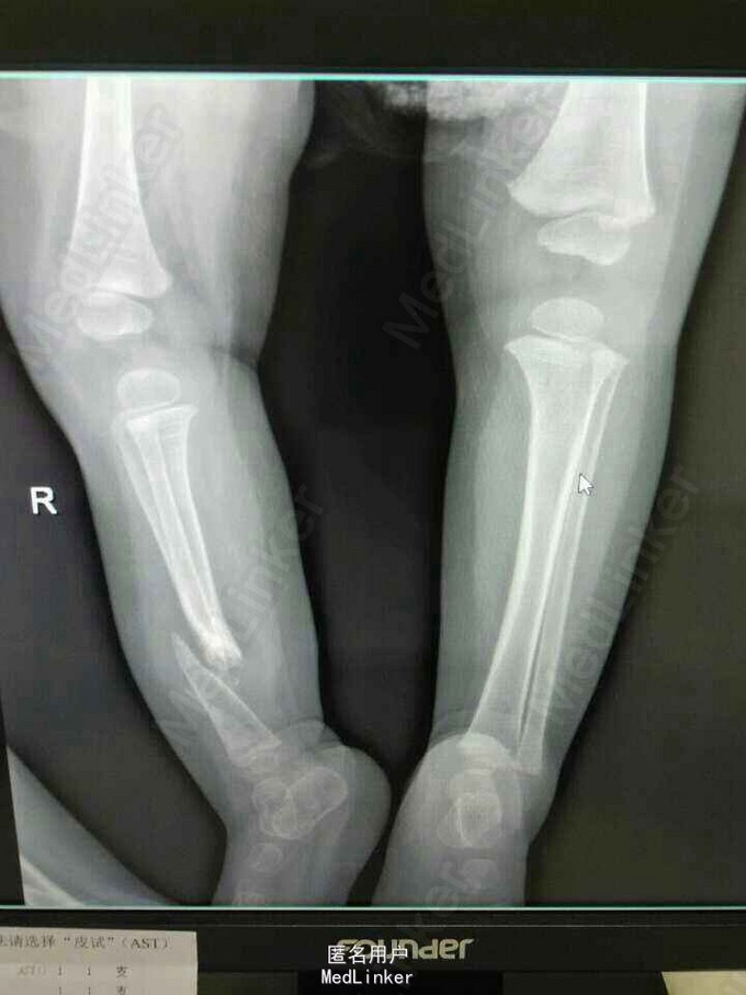 患女1岁8个月,患者母亲诉小孩出生时右小腿畸形,1岁时学走路跌倒后哭闹数天,小腿肿胀去医院检查示右胫腓骨折,稍做固定,1岁3个月时复查骨折未愈合,考虑先天性胫骨假关节,行手术治疗,现术后5个月复查未愈。目前小儿不能行走。