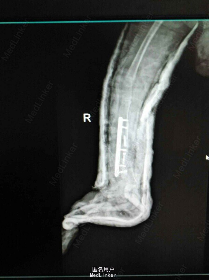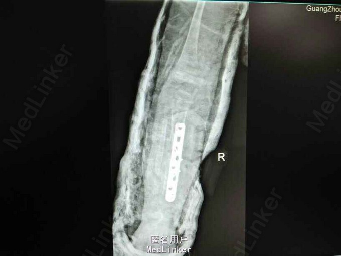 神经纤维瘤病,先天性胫骨假关节。该患者经过讨论及与家属多次沟通愈后情况,行病灶切除,取母体骨移植,AO锁定钢板内固定,暂时管型石膏外固定,并订制支具