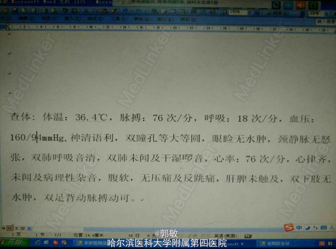 血压:160/94mmhg,心肺无著征,腹平软,无压痛,双下肢无浮肿。