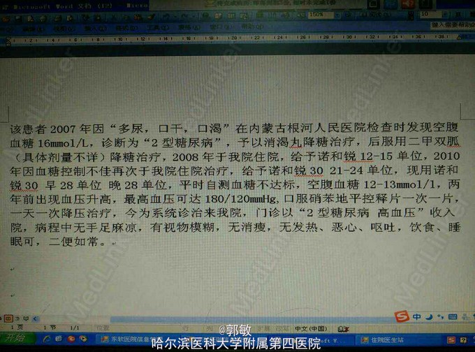 发现血糖高八年,血压升高两年。应用诺和锐30早28u晚28u餐前皮下注射,血糖控制不佳,维持在12-16mmol/l.2年前出现血压升高,最高达180/120mmHG.口服硝苯地平控释片,一片一天一次口服。
