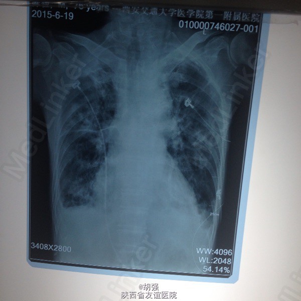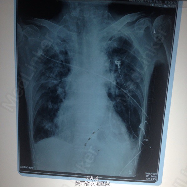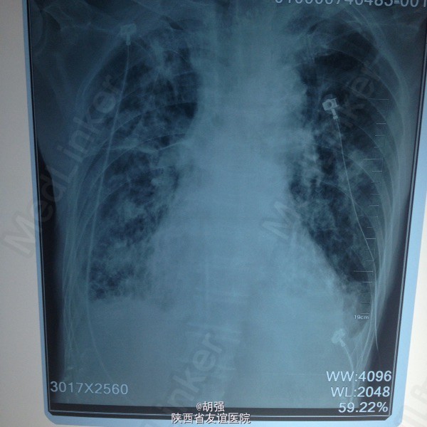 查体:口唇略紫绀,口腔黏膜无充血、糜烂、溃疡;颈静脉怒张,桶状胸,两侧呼吸动度及语颤减弱,叩诊呈过清音,两肺呼吸音粗糙,可闻及哮鸣音及湿性啰音。心率110次/分,律不齐,心音强弱不等,各瓣膜听诊区未闻及病理性杂音。腹平软,无压痛,肝脾肋下未及,双下肢水肿。 血常规: 白细胞14.01XE9/L、中性细胞比率91%、血红蛋白170g/L、血小板370X10E9/L。