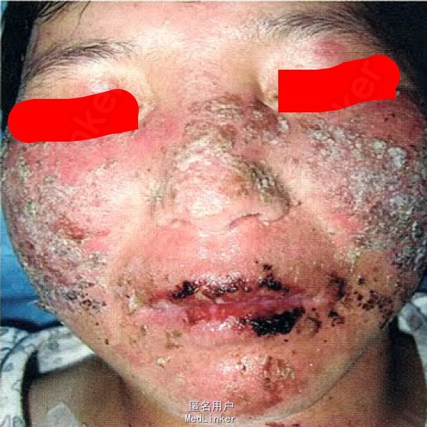 皮肤科情况:面部肿胀明显,面颊部、颈部、前胸“v”字区见片状浸润性红斑、暗红斑,其上散在少许米粒大小丘疹及数个甲盖大小松弛性水疱,尼氏征阴性,部分疱壁破溃见浅表红色糜烂面,上覆痂壳及鳞屑;口腔上腭见数个米粒大小水疱,口唇见数个糜烂面,上覆血痂及药痂。双前臂亦见大小不一暗红斑,部分中央轻度坏死,似“靶形损害”。实验室及辅助检查:白细胞6.5×109/L,中性粒细胞0.81,淋巴细胞0.11。尿蛋白++,隐血+。血钾3.54 mmol/L。丙氨酸转氨酶84 U/L,谷氨酰转肽酶102 U/L。空腹血糖7.2 mmol/L。心电图、心肌标志物、风湿因子、类风湿因子、C反应蛋白、抗链球菌溶血素O、血细胞沉降率、肿瘤标志物、肾功能、免疫球蛋白及补体均无明显异常。血清抗核抗体(ANA)阳性(1:100,均质型),抗Ro抗体阳性,抗核糖核蛋白抗体P阳性,抗组蛋白抗体阳性,抗Sm抗体和抗双链DNA(dsDNA)抗体阴性。血清BPl80、Dsgl、Ds93均为阴性。