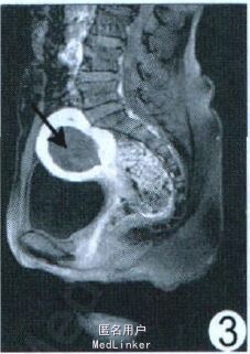 查体:子宫增大如孕8 周。实验室检查:血绒毛膜促性腺激素1.76 mIU/ml 。超声:子宫实性占位, 肌瘤变性。M RI :子宫明显不均匀增大, 宫腔内见约5.13 cm ×4.62 cm 类圆形异常信号, T1WI 呈等低信号, 其内见部分高信号(图1), T2WI 呈低信号, 其内夹杂线状、片状明显高信号(图2);增强后无强化(图3)。M RI 诊断为子宫腔内占位:子宫肌瘤(黏膜下型), 大部分变性。