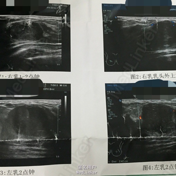 PE:双乳丰、对称。右乳1点、3点皮下触及3*2cm韧硬光滑肿块,左乳3点触及3*3cm韧硬光滑肿块、7点触及韧硬小结节、外下结节样韧厚。无溢液。双腋(-)。 双乳彩超:双乳实性占位:纤维腺瘤?