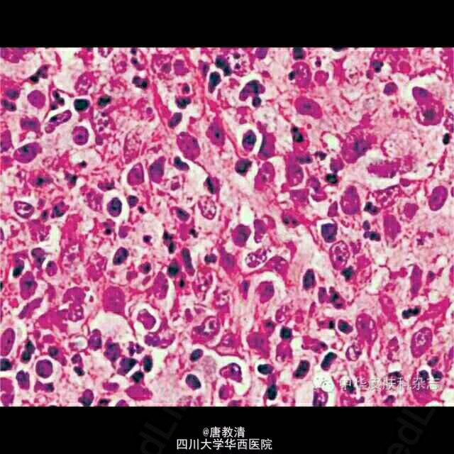 体检:左侧耳大神经,双侧腓总神经粗大。 皮肤科检查:面颈部、躯干、腋下、四肢散在丘疹、结节、部分破溃结痂;双侧眉毛外2/3脱落,双侧腋毛完全脱落。部分皮疹温度觉减退,痛觉及触觉未见明显异常。 组织病理及免疫组化结果见下。