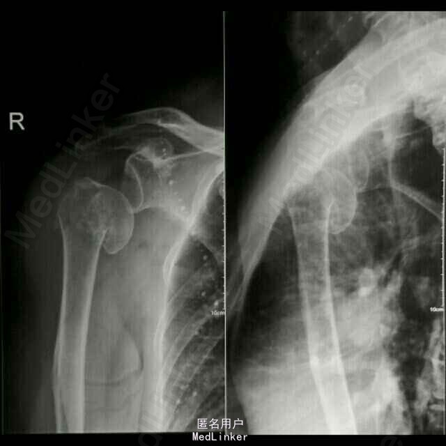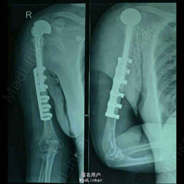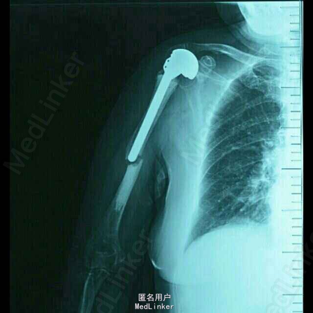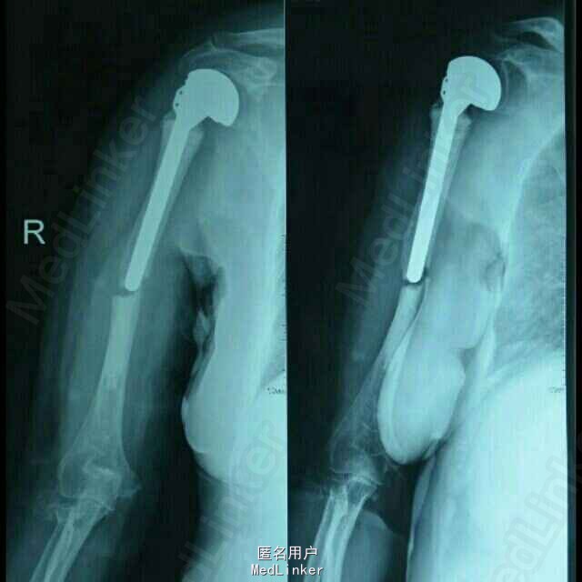 专科检查:右肩关节前内侧见一长约15cm的斜行手术疤痕,愈合良好,局部无红肿及压痛,右侧肩关节未见明显畸形,功能活动尚可,因上臂牵涉性疼痛活动受限,肩部无异常触痛;右上臂肿胀、畸形明显,皮肤张力稍高,局部假关节形成,局部皮肤无破损,未见明显挫伤痕迹,皮温正常,触痛明显,以右肱骨干中段处为甚,可扪及明显的骨摩擦感及异常活动;右肘关节无红肿及压痛,右肘关节伸直活动受限约30度,屈曲活动正常,右前臂活动正常;右上肢纵向叩击痛(++),患肢末梢循环、感觉、活动正常。 DR示:右侧人工肱骨头置换术后伴假体周围骨折,慢支炎肺气肿伴左侧胸腔积液。 颅脑MRI示:两侧基底节区陈旧性腔梗。