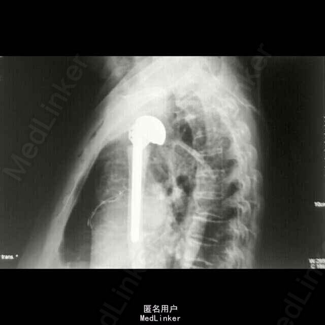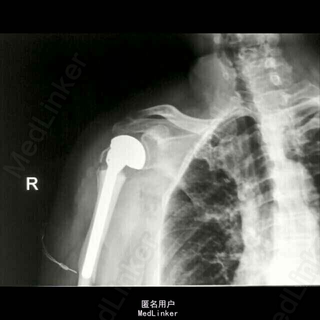 诊断:1、右侧人工肱骨头置换术后伴假体周围骨折 2、慢性肺气肿伴左侧胸腔积液 3、双侧脑基底节区陈旧性腔隙性脑梗塞灶 4、血压病(2级 高危层) 5、骨质疏松症(重度) 6、右髋关节置换术后 治疗: 因患者高龄,基础疾病较多,较重,故手术风险大,经呼吸内科,心血管内科及神经内科会诊及治疗处理后,患者内科病情控制稳定,予行手术治疗,术中检查,右肩关节假体无松动,故单纯予行假体周围骨折固定术治疗。