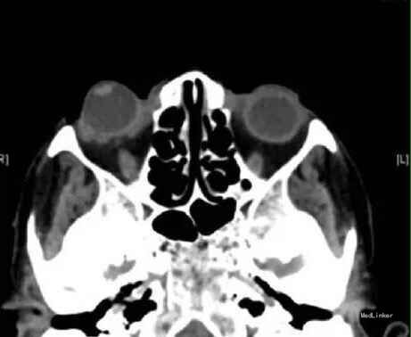 右眼视力:HM,IOP:54mmHg,上下眼睑均位于脱位的眼球后,角膜水肿。
