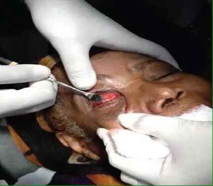 诊断:外伤性眼球脱位 处理:用代马尔眼睑拉钩使眼球复位