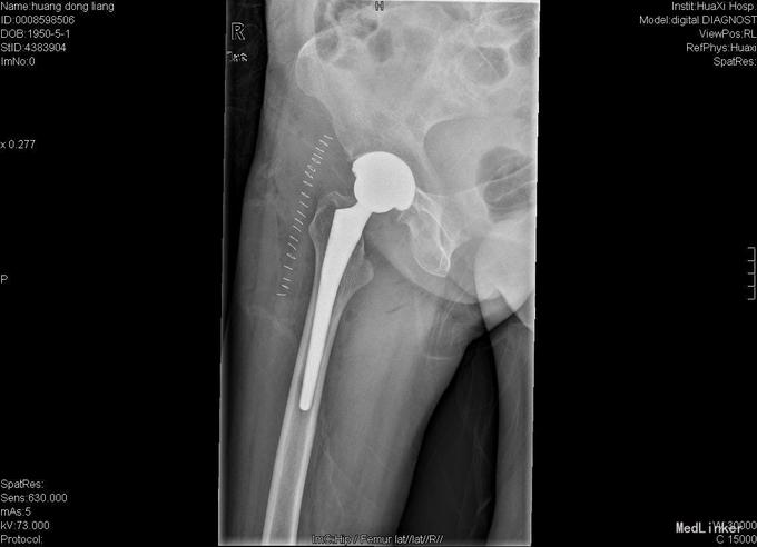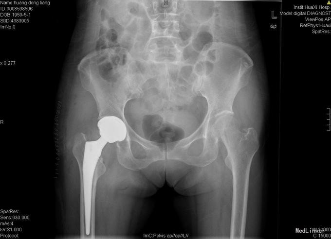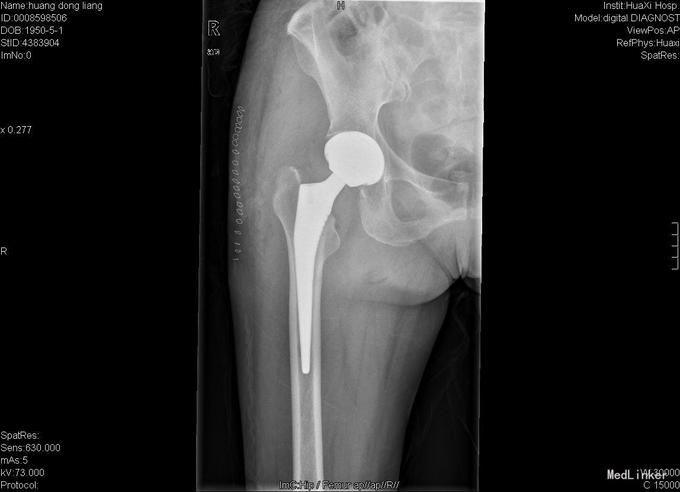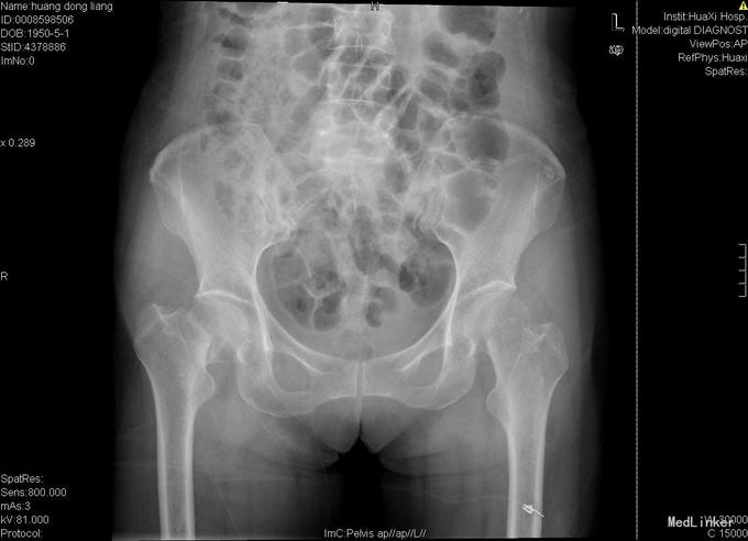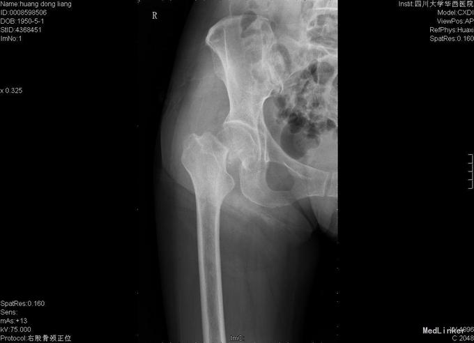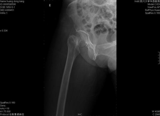 患者女,70岁,因"摔伤后右髋部疼痛、活动障碍10小时"入院,患者诉10小时前在家不慎滑倒,当即感觉右髋部疼痛、活动障碍,于当地医院急诊检查示:右股骨颈骨折,为求进一步诊疗故来我院。