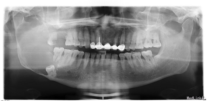 双侧颜面部不对称,右下颌隆起,约4cm*7cm,表明皮肤无异常,皮温无升高,质地硬,边界尚清,无压痛,无乒乓球样感,无左下唇麻木,无张口受限,开口度、开口型正常,双侧髁突动度一致,开闭口未闻及关节明显弹响音。口内检查:右侧下颌肿物,下颌骨颊侧隆起,边界清,无压痛,表面粘膜无破溃,双侧头颈部有扪及明显肿大淋巴结。
