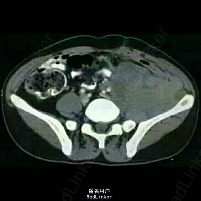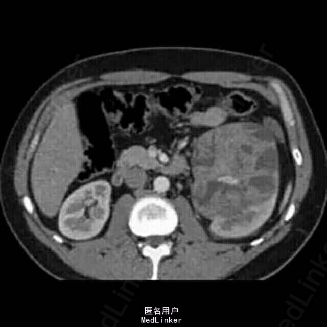 考虑“左肾恶性肿瘤”可能性大。遂行肾癌根治术,术中见腹膜后及周围粘连明显。术后病理示:透明细胞癌,8*6*3cm,侵及肾纤维膜,分期PT4N0M0.术后干扰素治疗3个月。1年后因左上腹疼痛伴血尿再次至我院就诊,CT提示腹膜后软组织结节,腹主动脉旁、左侧腰大肌肿物。考虑肿瘤复发转移,遂行腹腔复发灶姑息切除,肿瘤30*20*30cm,术后与索坦治疗后。