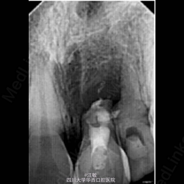 检查发现21牙II度松动,叩诊不适,活力测试无反应。 X线片发现21牙根中折裂,牙根吸收,根管存在钙化,周围存在低密度影。