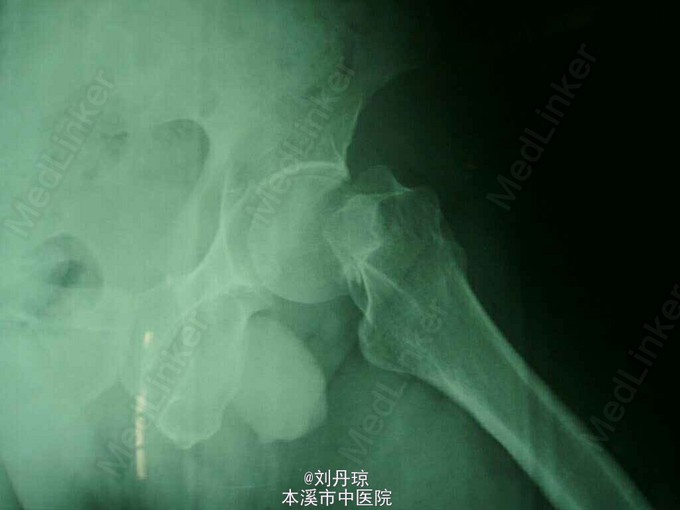 查体:右髋关节无明显肿胀,右腹股沟中点压痛阳性,右下肢短缩约2cm,大粗隆叩痛阳性。右髋关节功能障碍。辅查:Garden IV型股骨颈骨折,移位明显。