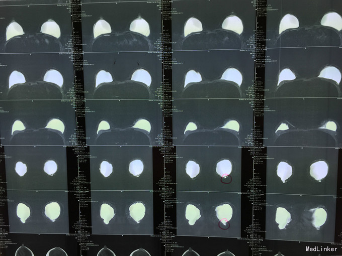 查体:生命体征平稳,神志清楚,查体配合。心肺腹体格检查未见明显异常。专科情况:双侧乳房大小较一致,左侧稍高于右侧,表面皮肤颜色正常,无破溃处出现。乳房触之较软,左侧乳房有压痛。 辅查:胸部磁共振影像资料