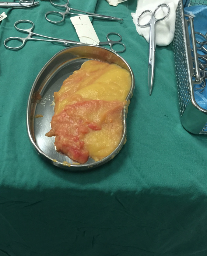 随访:患者术后恢复良好。现已出院。有需求的患者可在取出注射物手术同时放置假体。 讨论:奥美定,学名聚丙烯酰胺水凝胶,是一种类似果冻状的液态物质。在上世纪九十年代,在我国,经过国家的药监局监测认证后批准生产,作为无毒,环保,低排异性的新人造脂肪投入使用,在2000年正式的投入批量生产,在整形美容行业进行了大规模的使用,从简单的隆鼻,丰太阳穴,到大一些的隆胸,丰臀,及各种的软组织凹陷填充。随着对奥美定的研究,它在人体内分解成单体之后,对人体的损害极大,能够影响到人的神经系统,造成内分泌的紊乱,还有致癌的危险。2006年4月30日, 国家食品药品监督管理局撤销了奥美定的医疗器械注册证 ,全面停止其生产、销售和使用。在随后的时间里,各家大型的整形医院逐渐为患者做取胶手术,但是十多年过去了,还有很多患者前来医院取胶,当时的风靡程度可见一斑。