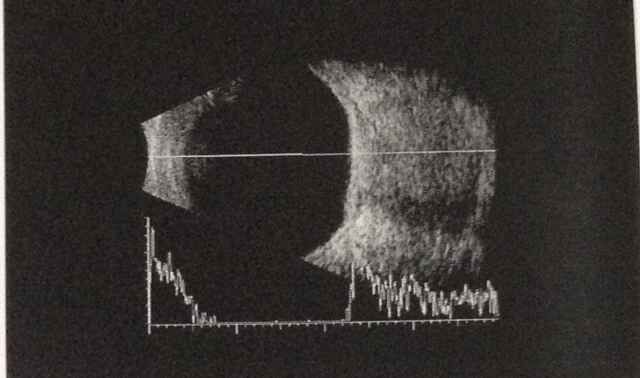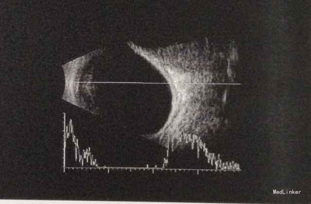 眼科专科查体:VOU 1.0,IOP: OD 16mmHg,OS 20mmHg,左眼球明显突出,上下方巩膜露白,眼球活动无明显受限,角膜见一圆形斑翳。B超检查显示左眼眶占位,CT检查示左眼球后肌锥内占位。