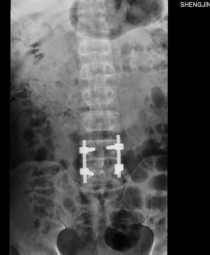 诊断:腰椎间盘脱出症,髓核游离 入院后完善检查,查无手术禁忌症后行腰椎间盘切除椎板减压椎弓根钉椎间融合器植骨内固定术