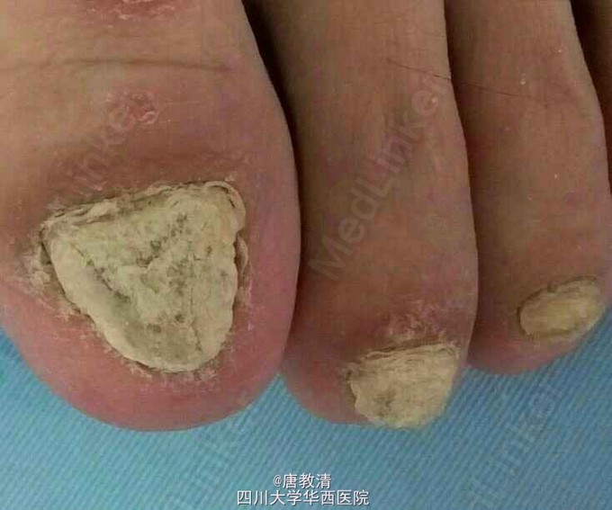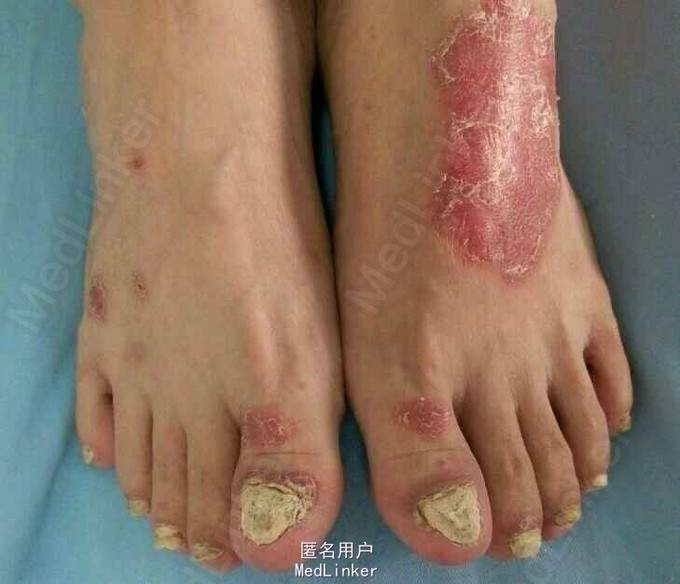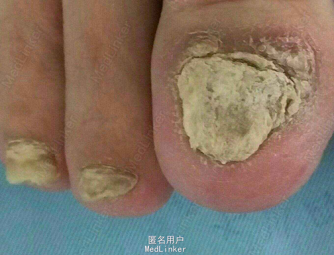 查体:全部指甲疏松、浑浊、增厚,部分趾甲损毁。 单看趾甲病变,考虑:甲真菌病?甲银屑病?