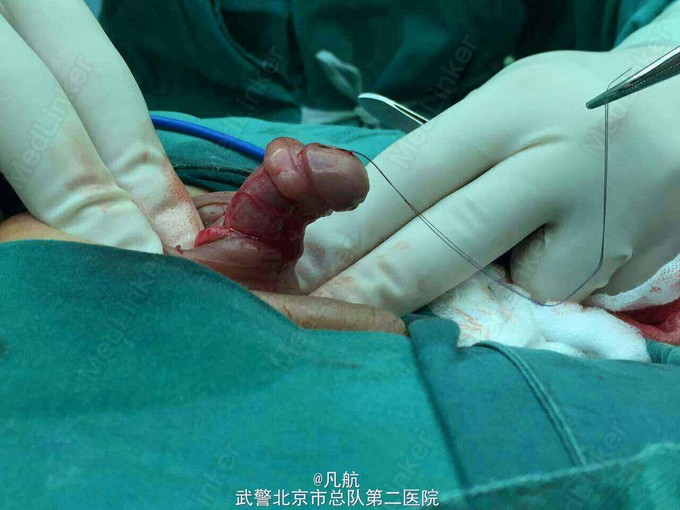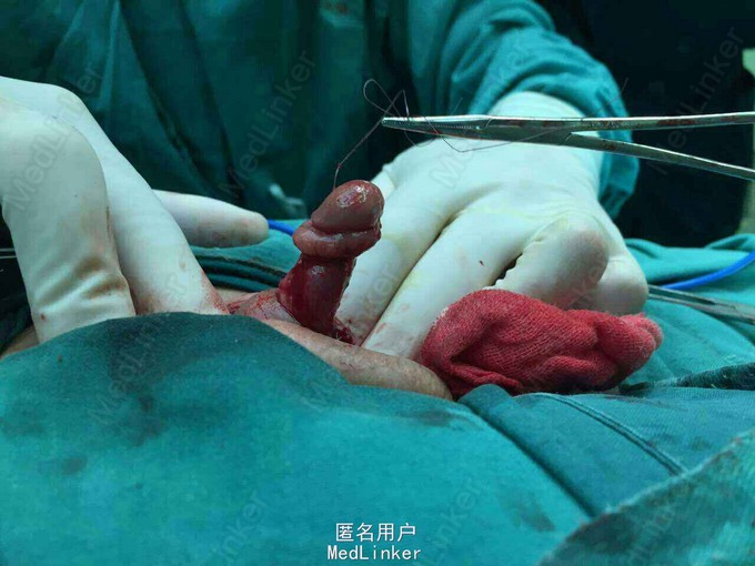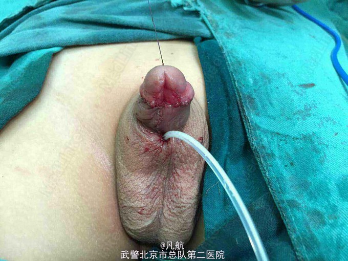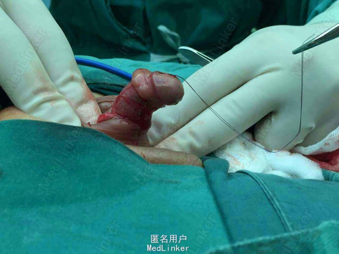 手术治疗、将包皮再次环切脱套。松解尿道周围纤维组织及将尿道离断后、尿道缺损长度约3厘米、尿道退缩于阴茎根部。修剪局部包皮、将其包绕修复创面。